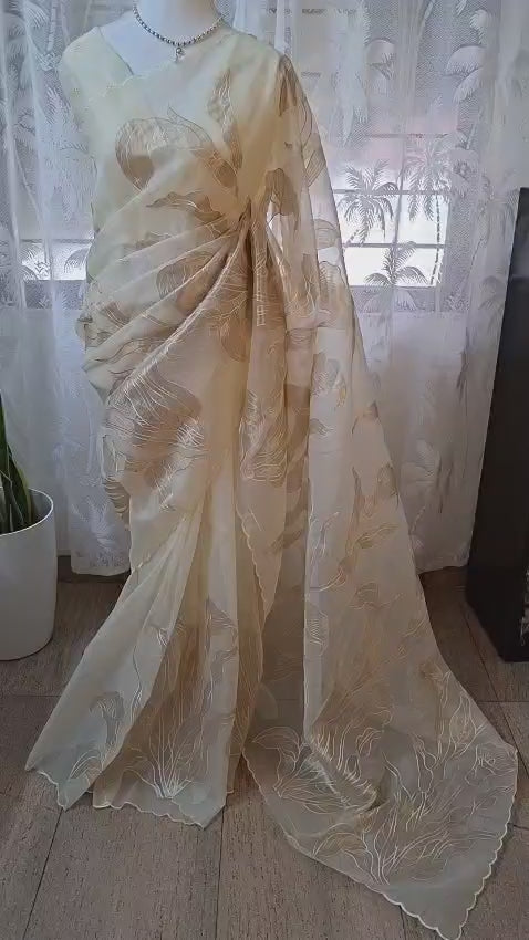Step into timeless elegance with this exquisite ivory organza saree, thoughtfully designed for effortless sophistication.