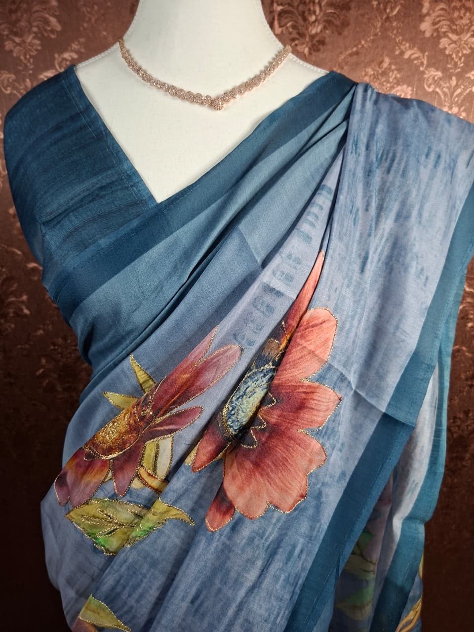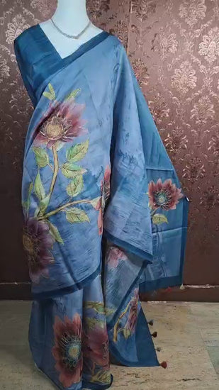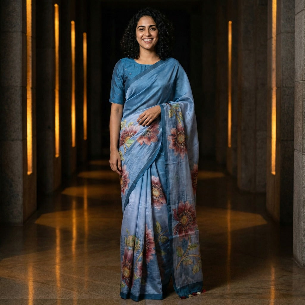 Elegant, artistic, and effortlessly graceful, this premium soft Tussar saree blends fluid drape with striking floral artistry.