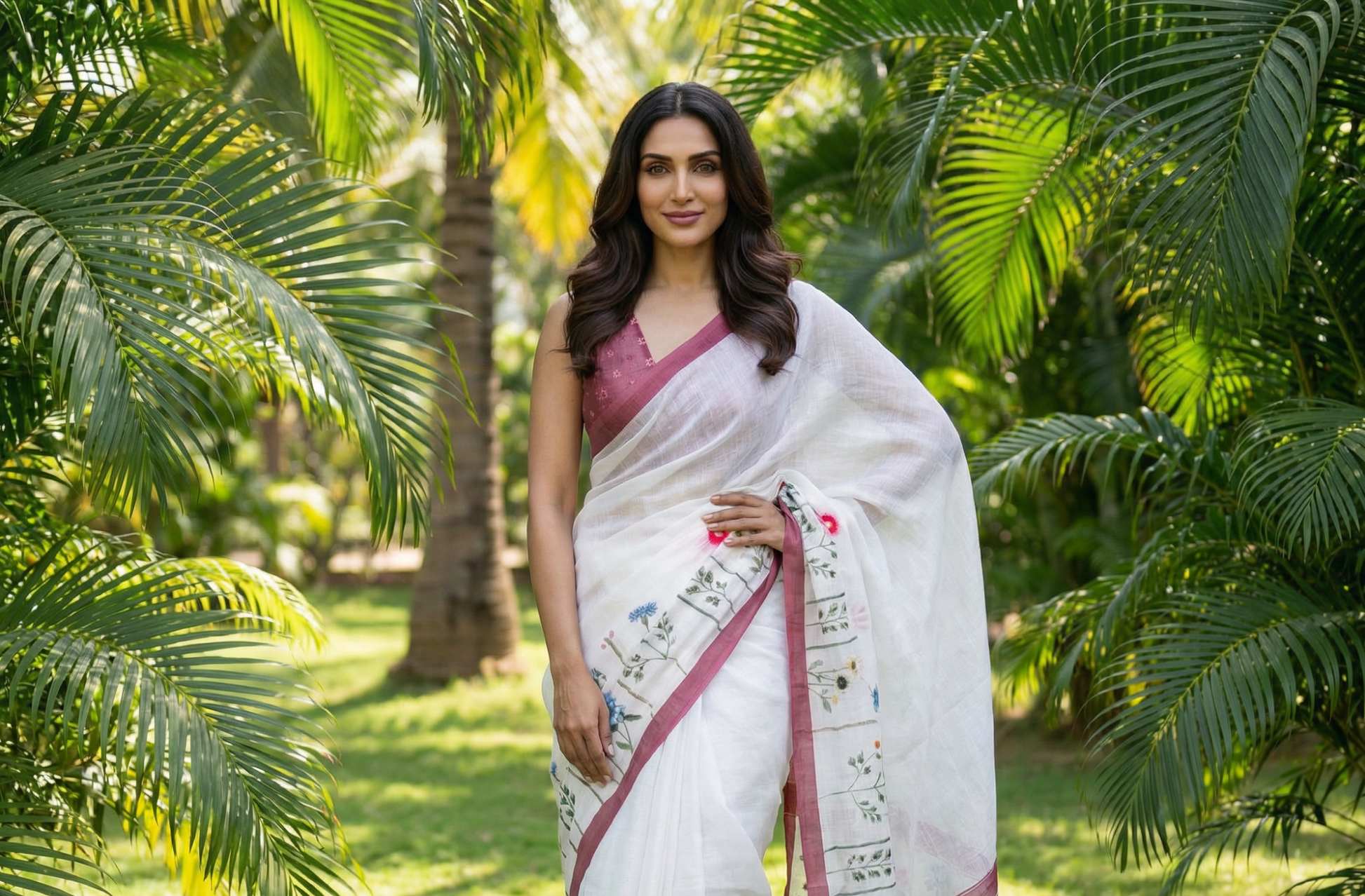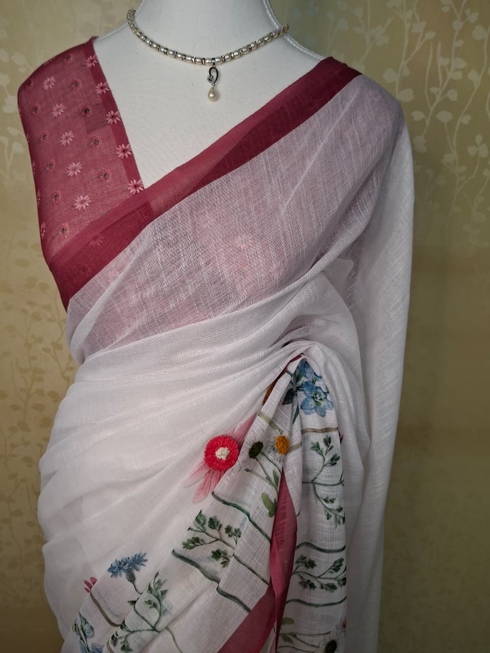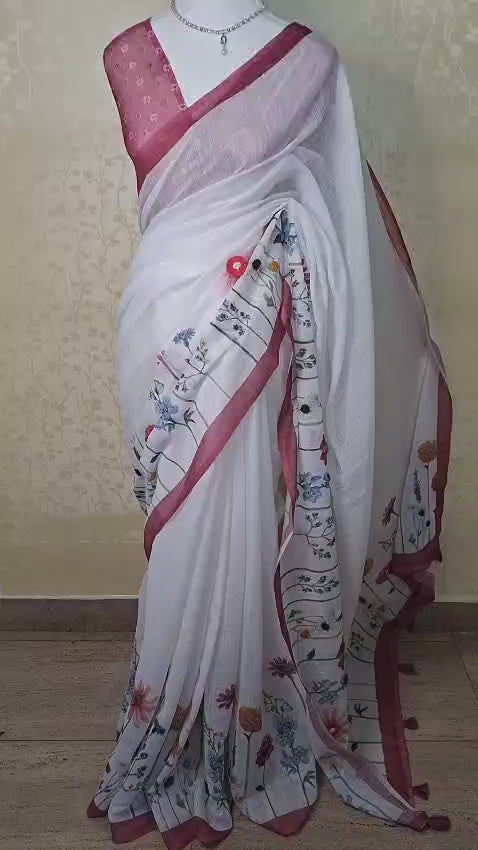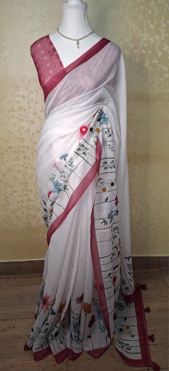 Crafted in fine linen, the saree offers a breathable texture with a gentle natural fall, ensuring comfort while maintaining an elegant silhouette. The serene off-white base creates a sophisticated canvas, beautifully enhanced by a rich rose-pink contrast border that adds warmth and definition.