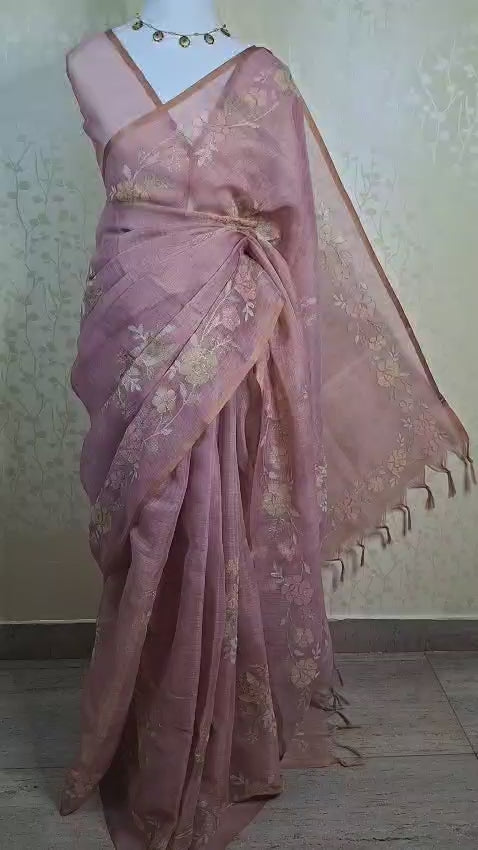 Graceful, soft, and quietly luxurious, this linen tissue saree reflects refined elegance with delicate floral artistry.