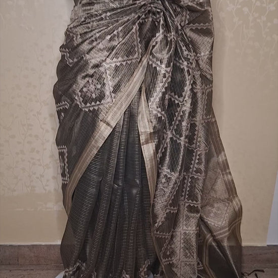 The saree features intricate woven geometric and traditional motifs across the body and pallu, creating depth and visual richness. Fine striped detailing along the border frames the design beautifully, adding structure and definition to the drape. The coordinated pallu with woven patterns enhances its artisanal appeal, while tassel accents lend a handcrafted finish.