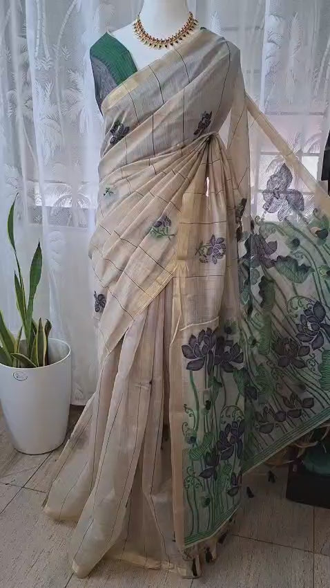 Crafted in breathable muga cotton, the saree offers a soft texture with a gentle natural sheen, making it ideal for extended wear. The body is adorned with delicate, evenly spaced floral motifs that add subtle visual interest while maintaining a calm, refined look. The highlight of the saree is its richly detailed resham-woven pallu, featuring graceful lotus patterns in deep blue and fresh green tones, lending depth and artisanal character.