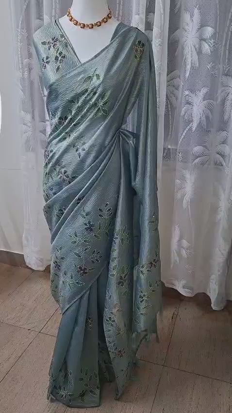 Graceful and serene, this pastel blue saree is crafted in a lightweight soft crush fabric that offers a gentle sheen and an elegant drape.