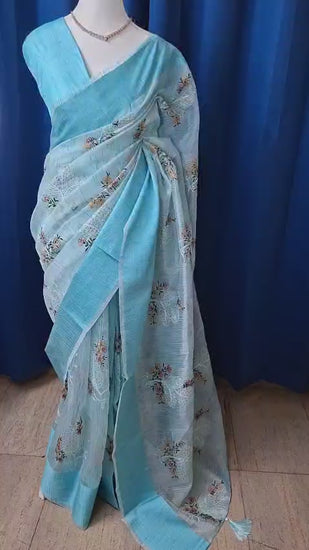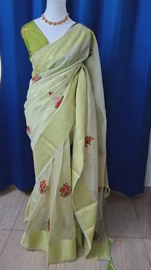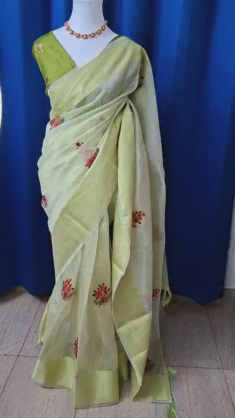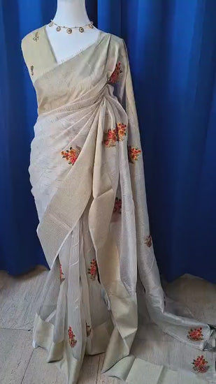 The lightweight fabric carries a subtle textured weave, giving the saree a refined, handcrafted feel. Delicate floral embroidery motifs in warm tones of red, pink, and green are scattered across the body, adding gentle pops of colour while preserving the saree’s calm, neutral palette. A simple jute weave border in a slightly deeper beige frames the saree beautifully, enhancing its natural aesthetic. The pallu is finished with small tassel details, lending a charming traditional touch to the overall design.