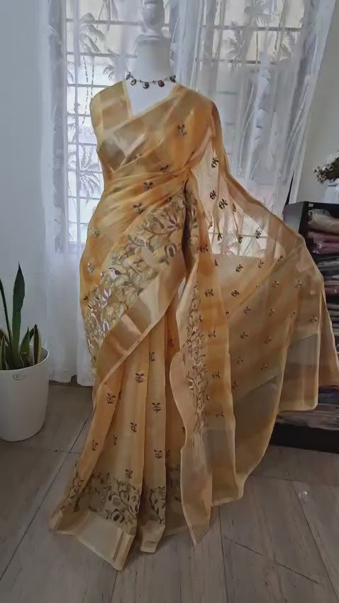 Crafted in soft, sheer Kora fabric, the saree features delicate all-over floral embroidery that adds refined texture without heaviness. The highlight is its beautifully embroidered border, adorned with bird and foliage motifs, giving the saree a distinctive artisanal charm.