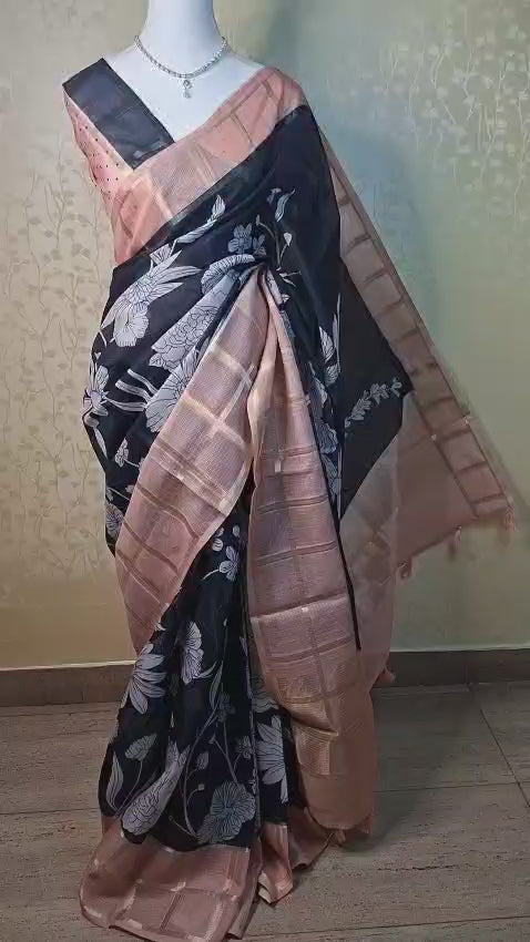 The contrasting charcoal-black pallu and body panel are adorned with bold floral prints in soft ivory tones, lending an artistic and contemporary character to the saree. The interplay of delicate checks and statement florals creates a balanced design that feels both classic and modern. A subtle zari-accented border enhances the look with a gentle touch of sheen.