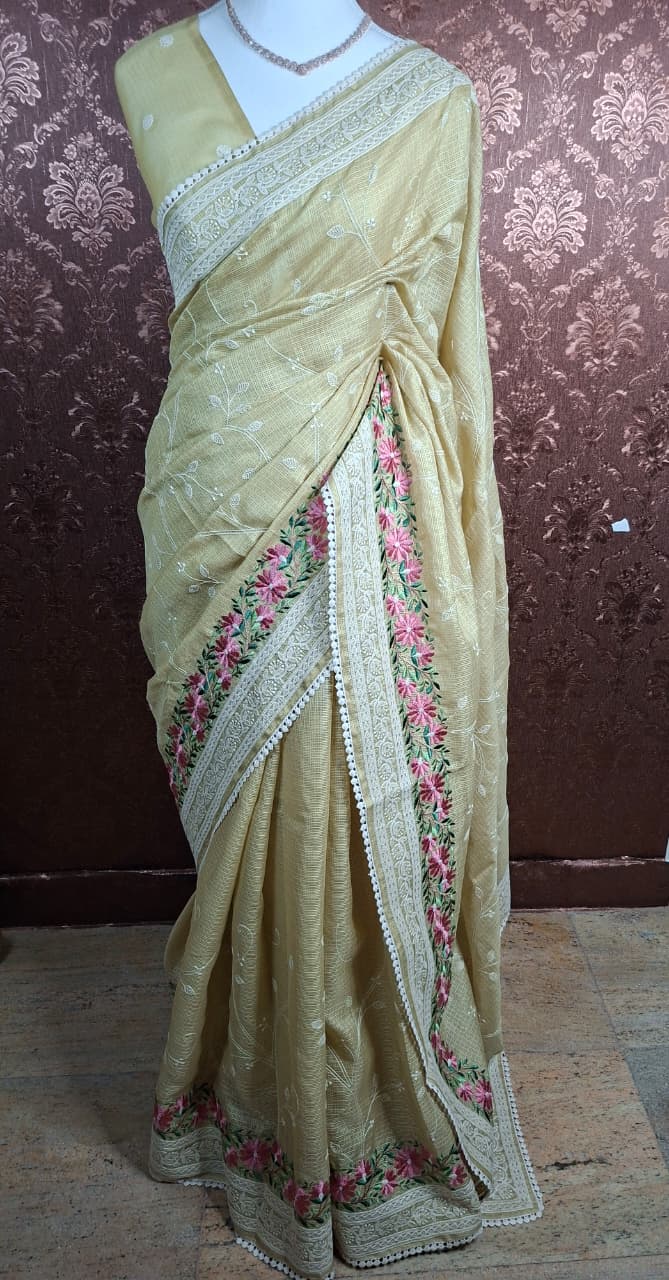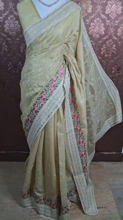 An intricately designed woven border frames the saree gracefully, while the delicate edging adds a polished artisanal finish. The pallu continues the floral embroidery and vine detailing, completing the look with elegance and balance.