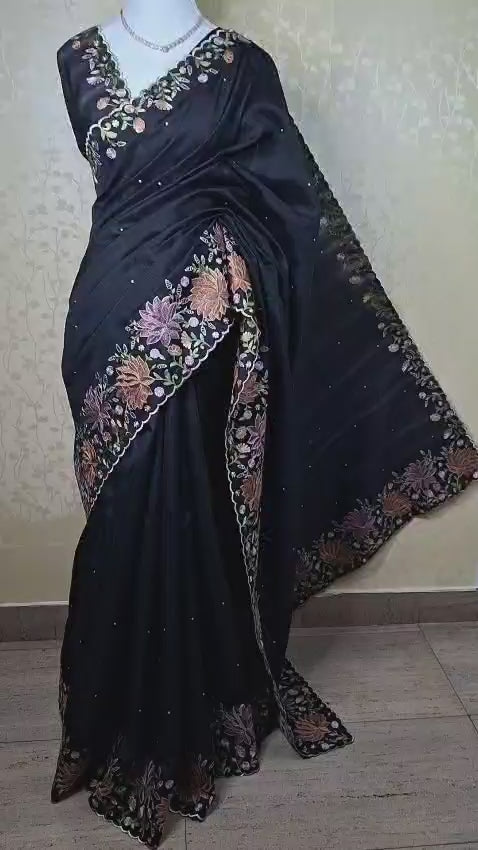 The saree is adorned with exquisite multicolour floral embroidery along the border and pallu, forming an intricate garden-like pattern that adds vibrant contrast against the dark base. The delicate threadwork highlights detailed blossoms and leafy vines, creating depth and artisanal charm. Scattered bead-like embellishments across the body add a subtle sparkle, elevating the overall elegance without overpowering the design.