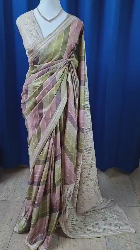 Crafted in tussar silk, the saree features a soft, natural texture with a graceful drape. The body is designed with subtle check and stripe patterns in muted pastel tones, lending depth and quiet sophistication to the overall look. The restrained colour palette enhances the saree’s calm, earthy appeal, making it versatile and timeless.