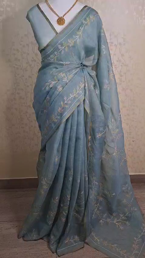 The saree is adorned with delicate vine-style embroidery flowing across the body and along the border. Rendered in soft pastel tones, the floral vine motifs add subtle colour and handcrafted charm while maintaining a refined and minimal aesthetic. The embroidery beautifully complements the serene pastel blue base, creating a harmonious and graceful look.