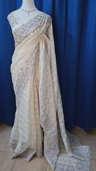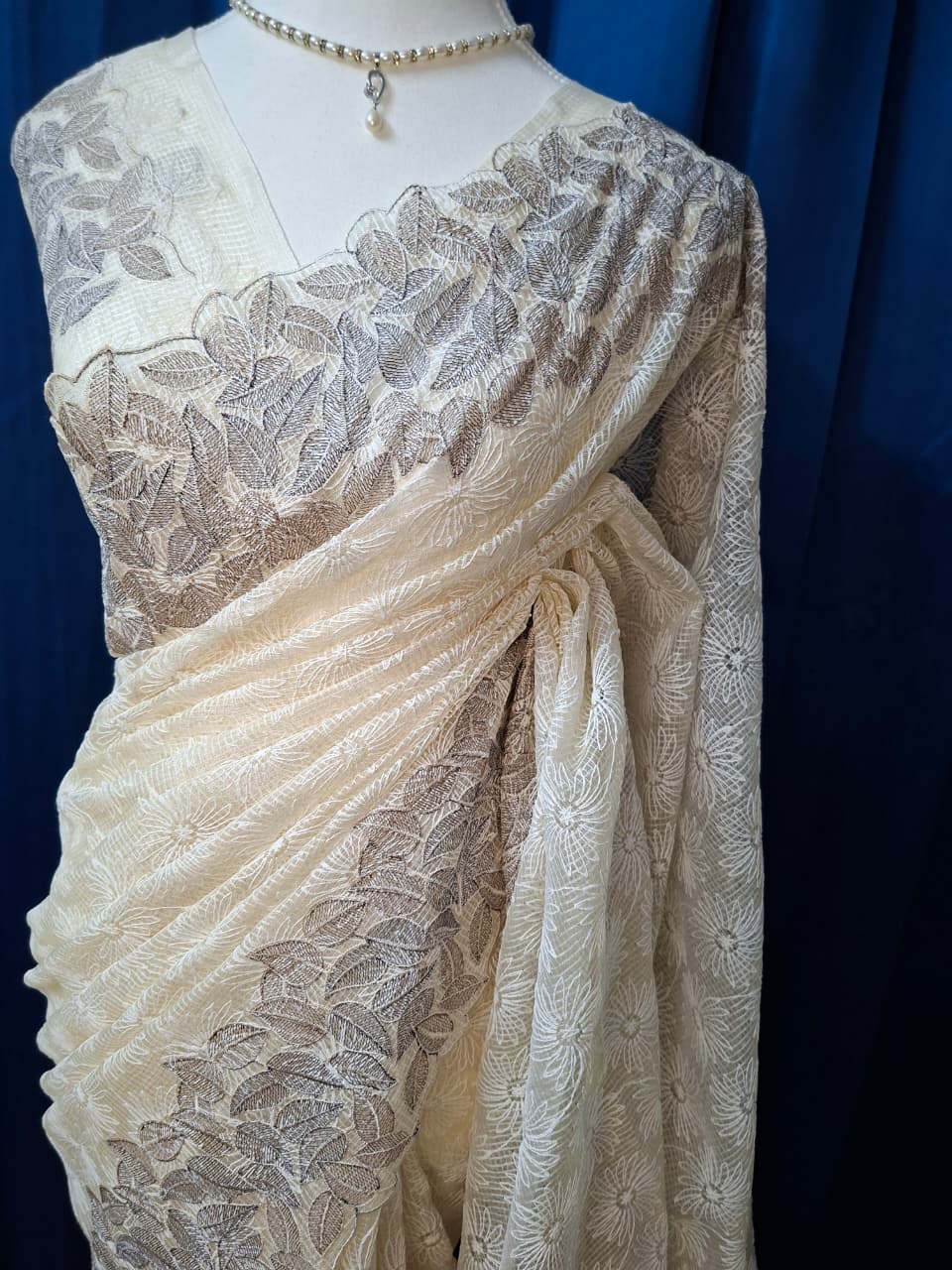 Crafted in lightweight net Kota fabric, the saree features white phulkari-style floral embroidery spread evenly across the body, creating a soft and refined texture. The subtle embroidery enhances the saree’s lightness while maintaining visual depth. A contrasting leafy and floral border beautifully frames the drape, adding definition and a gentle decorative accent.