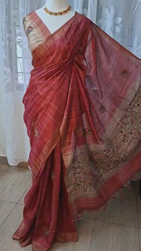 Graceful and earthy in appeal, this soft tussar saree is crafted in a warm Pink red hue tone, offering a natural texture and an elegant, handwoven feel.