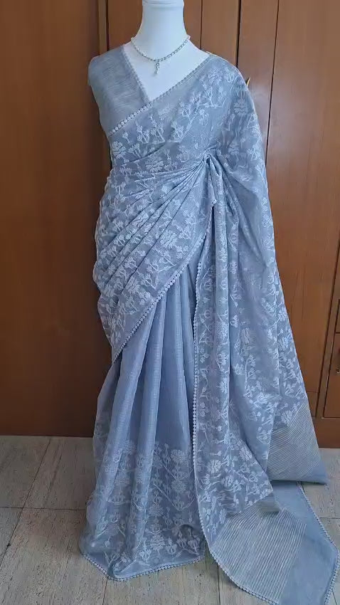 Elegant and understated, this tissue saree is crafted in a refined silver-grey shade that lends a light, graceful, and luminous appearance.