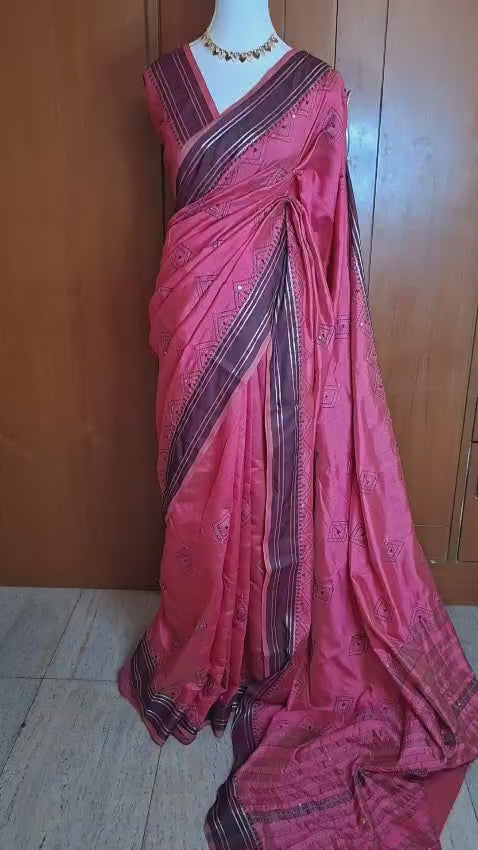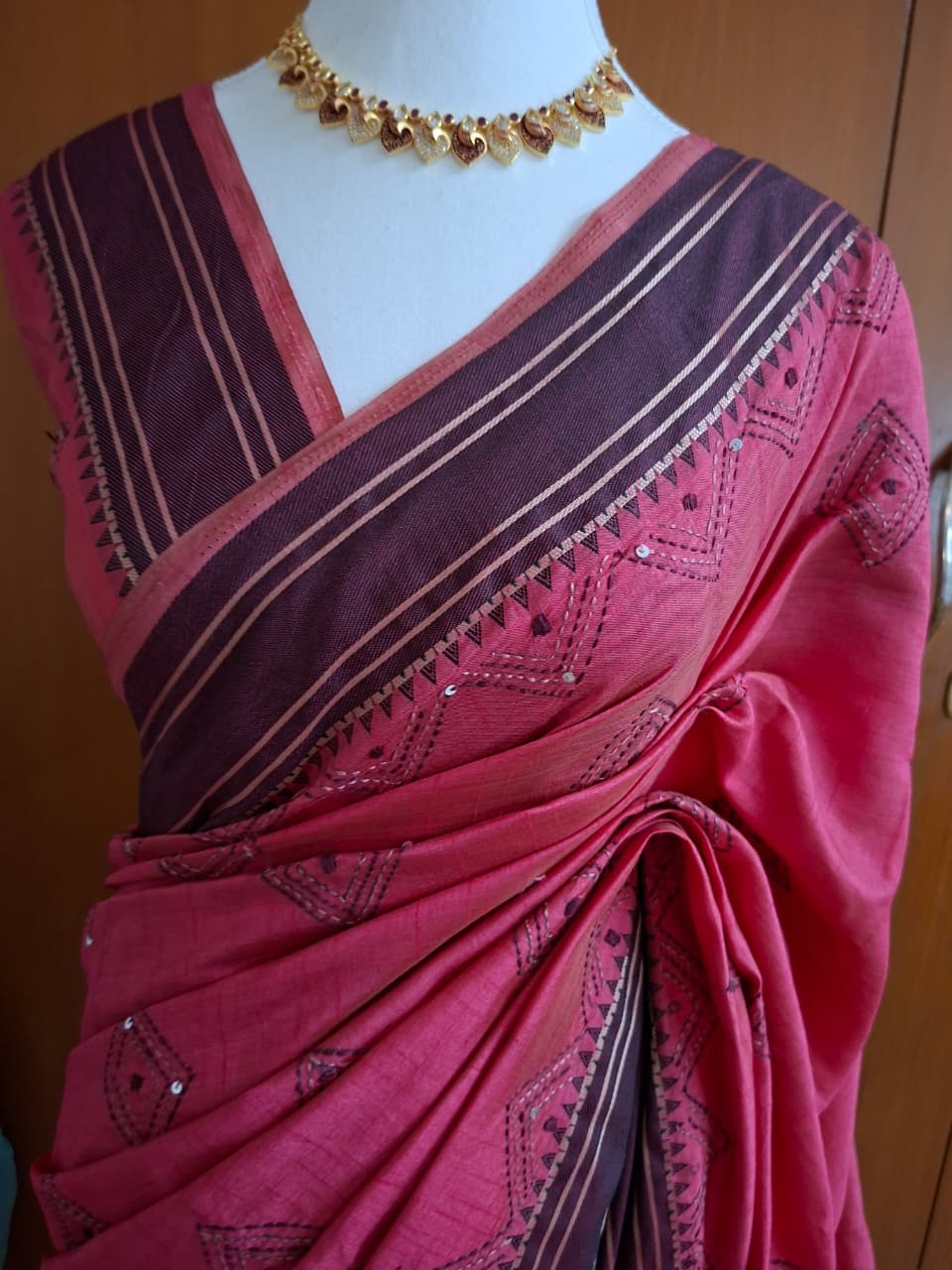 Elegant with a warm, earthy charm, this soft tussar saree features a rich coral pink base that brings vibrancy while maintaining refined sophistication.