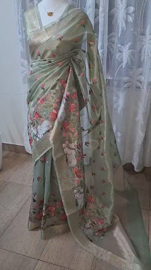 Elegant and graceful, this tissue silk saree is crafted in a soothing mint green tone, highlighted by a soft, natural sheen that enhances its refined appeal.